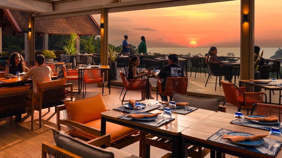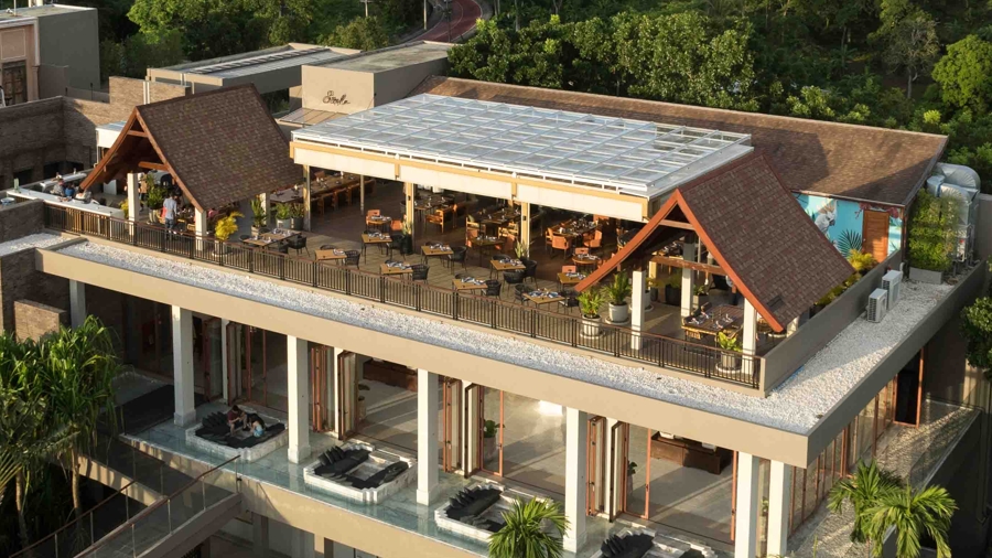 Distinguished by its sophisticated design that melds contemporary elegance with tropical aesthetics, Sizzle Rooftop Bar. Steak. Seafood features terracotta-hued cushions on comfortable lounge-style seating, sleek light wood flooring, and a roof with a modern slatted design and retractable cover that bathes the space in warm, ambient light or protects from the elements. Glass paneling allows diners to peer into the live kitchen, while showcasing tanks with live lobsters, seafood, and oysters, adding a dynamic and interactive element to the dining experience. The whole rooftop is open-sided or al fresco, offering panoramic views of the rain-forest-covered mountains and Andaman Sea. The bar area is vibrant, adorned with high stools to enjoy the sunset views and a stylish counter, complemented by twin Thai salas for group celebrations.