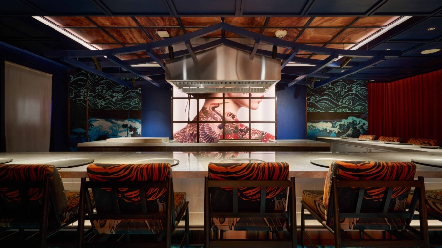 The restaurant features an immersive counter dining setting with interiors inspired by traditional Japanese body art, waves, and floral motifs, creating an elegant and artistic atmosphere.