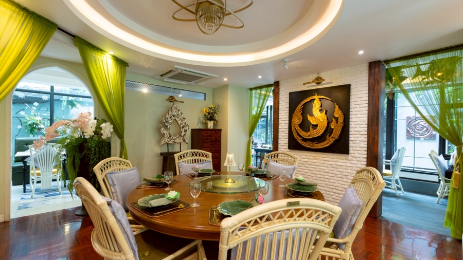 Guests are welcomed through a striking modern European-style glasshouse structure, where natural light and openness set the tone for refinement. Inside, the interiors highlight handcrafted Thai artistry and decorative details, blending natural wood, antique elements, artisanal accents, and soft lighting to create a setting that is both sophisticated and warmly inviting.