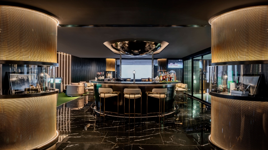 The latest technology is integrated into the entire venue, with motion capture systems that track golf swings and provide feedback and tips for improvement. Adjustable smart lighting and fiber optics create the perfect ambiance for different activities and moods.