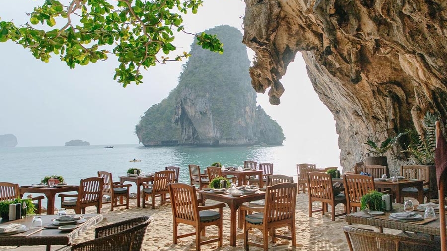 Tucked beneath a majestic limestone cliff at the edge of Phranang Beach, The Grotto offers a dining experience as enchanting as its setting. Whether you're savoring a relaxed lunch with your favorite book or indulging in the Twilight Set Dinner as the sun melts into the horizon, every moment here is steeped in natural beauty and quiet elegance.