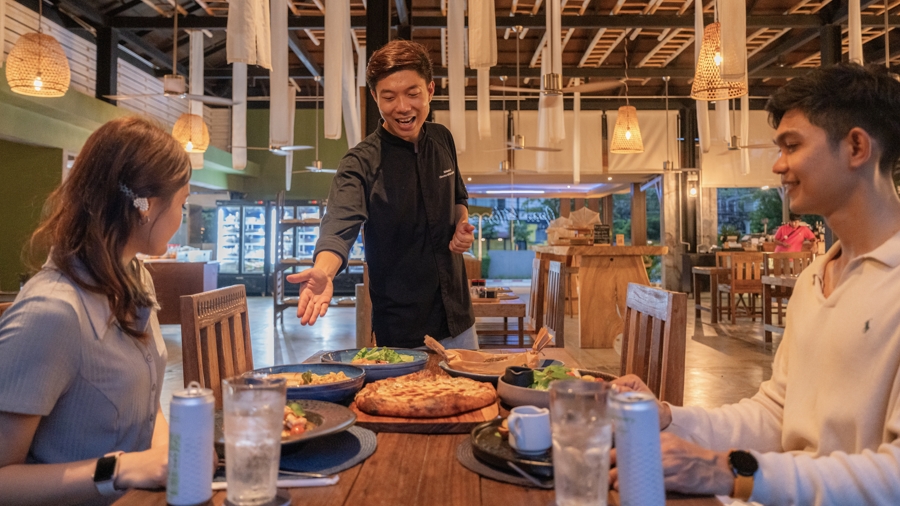 Outdoor garden seating provides scenic views of the lotus lake, while indoor dining areas offer a cozy yet contemporary atmosphere suitable for families, couples and groups. The surrounding gourmet park and picnic-style seating further extend the dining experience, creating a social and relaxed environment where guests can enjoy food, conversation and the rhythm of island life.